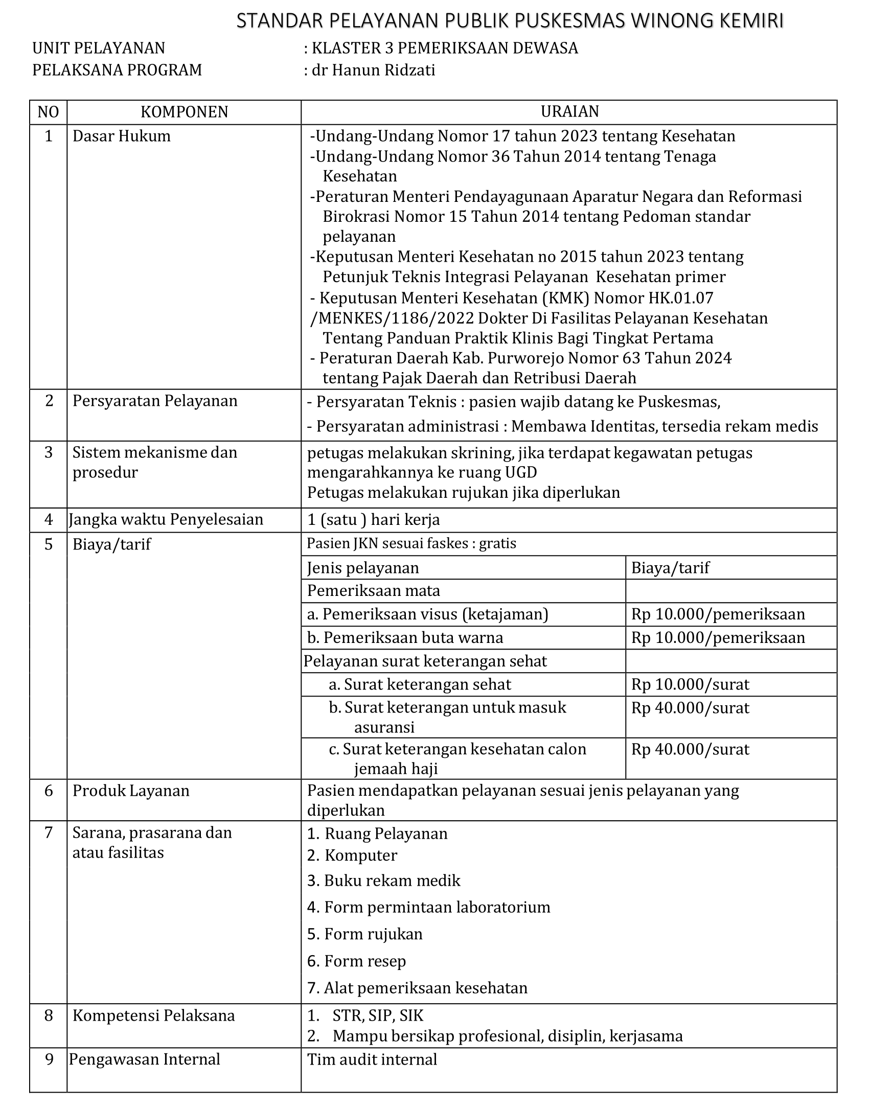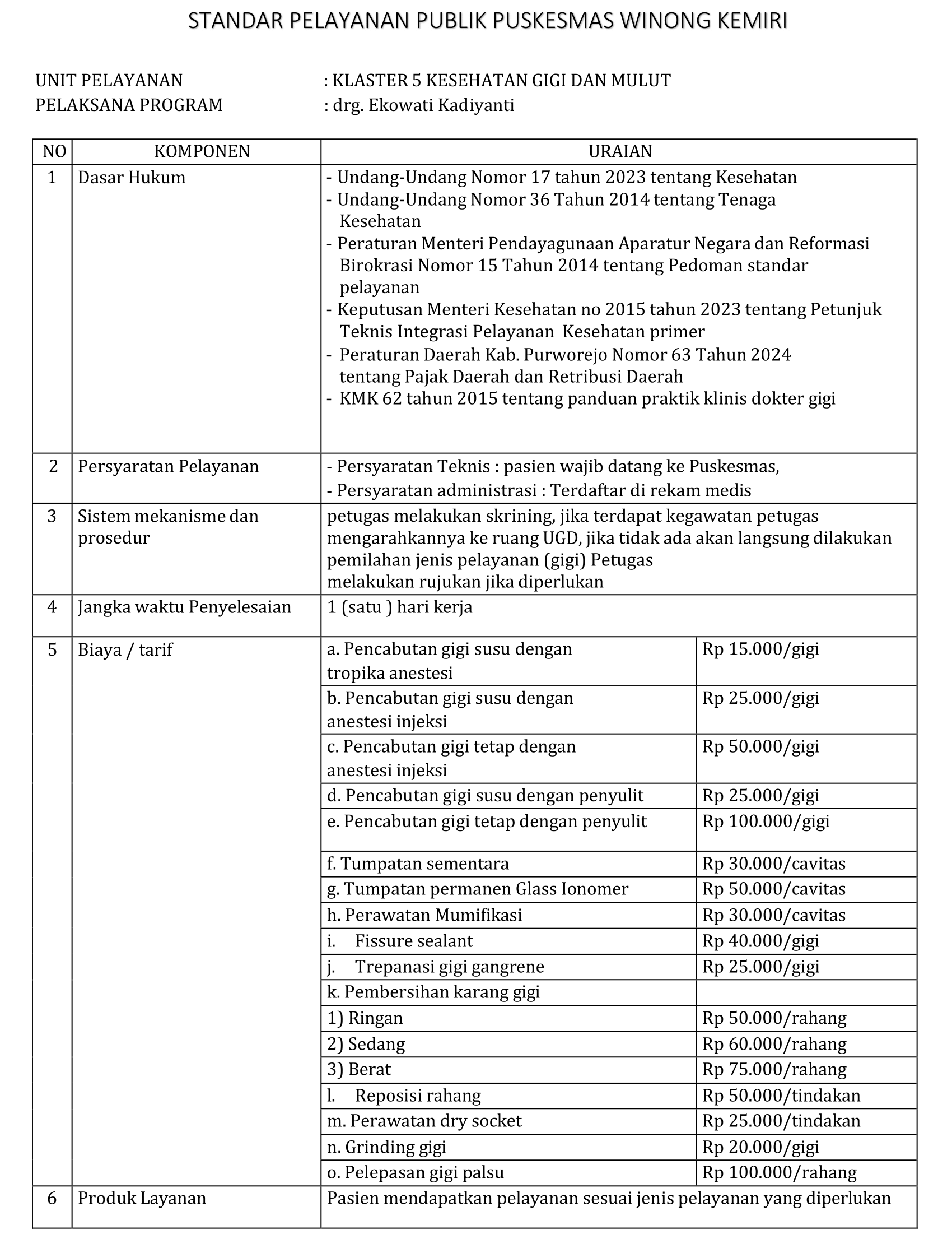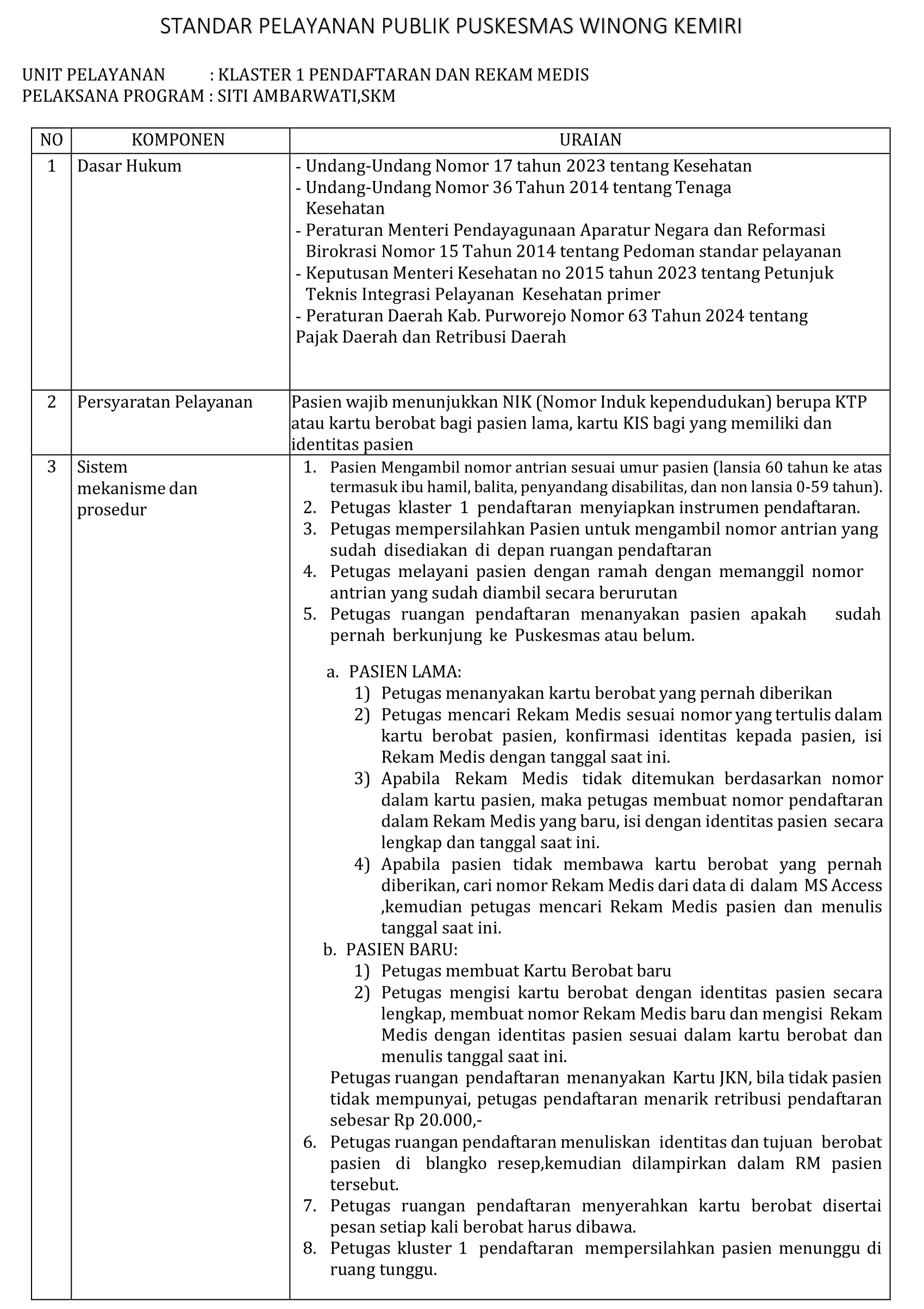 STANDAR PELAYANAN PUBLIK PUSKESMAS WINONG KEMIRI